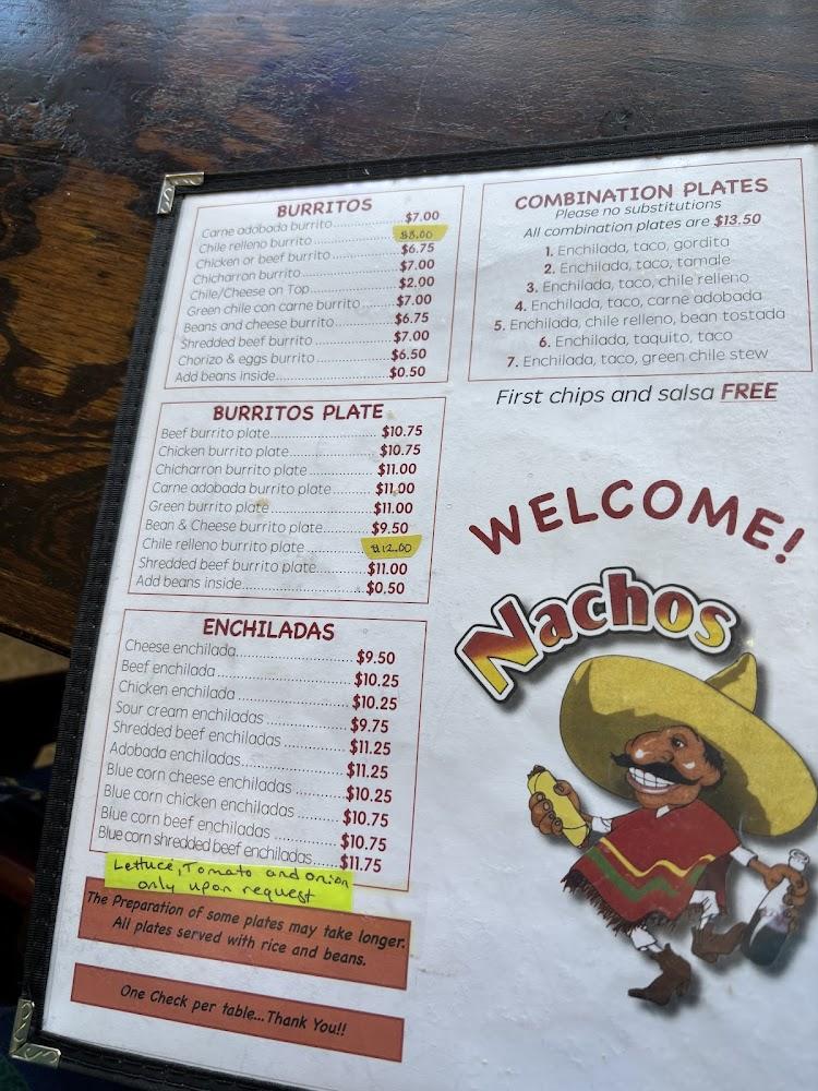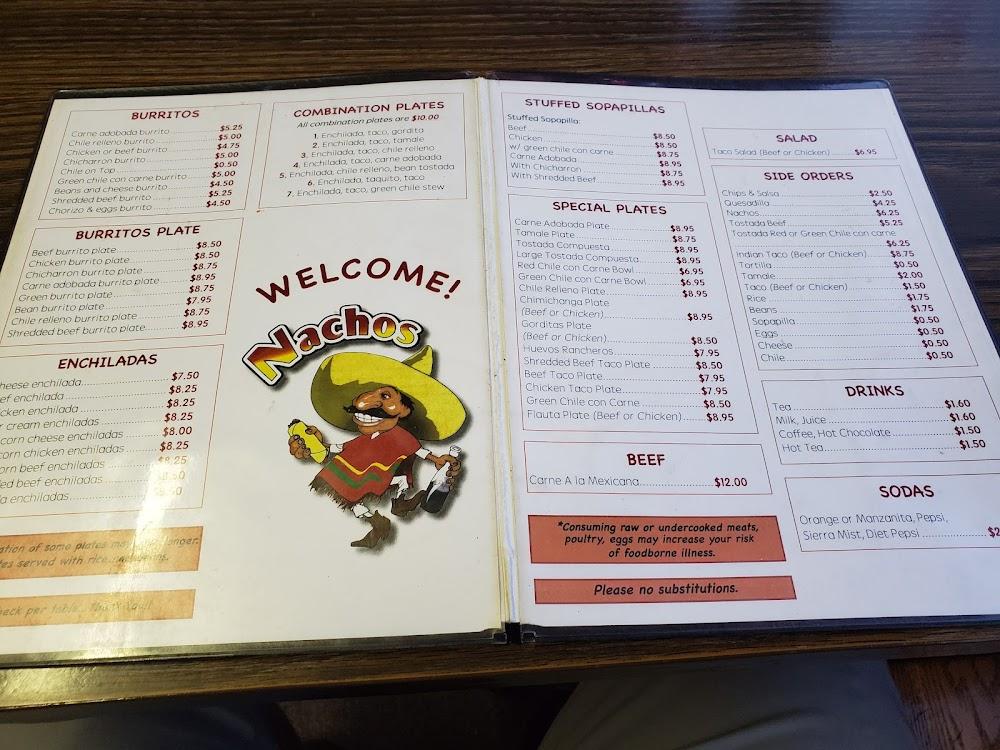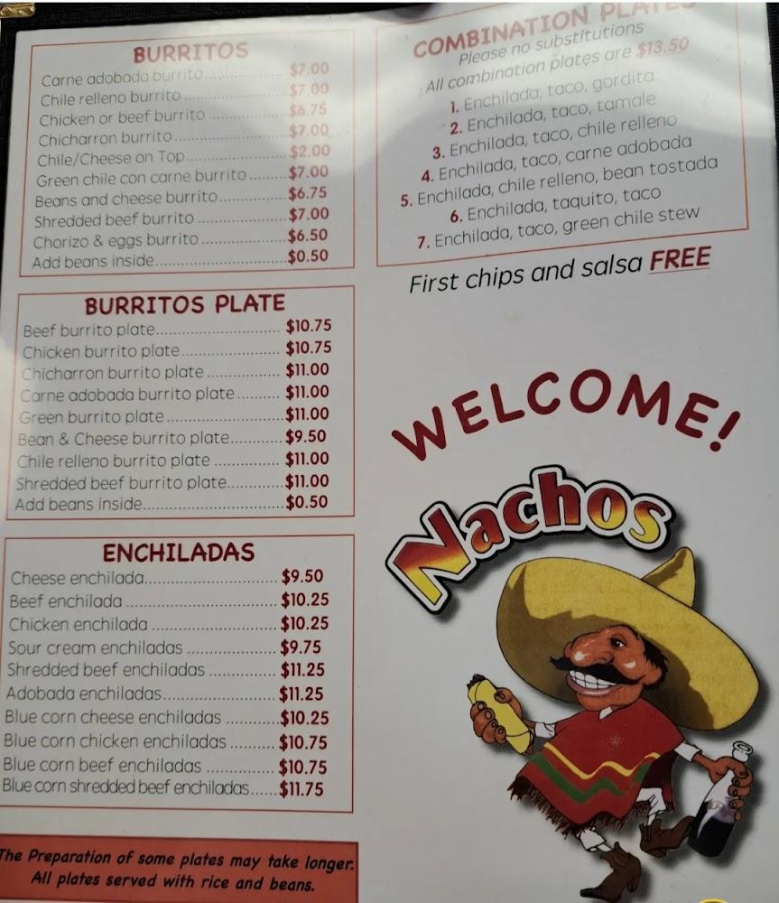 Nachos Restaurant features a diverse menu filled with New Mexican staples. The offering includes burritos, enchiladas, and traditional stuffed sopapillas. Each dish is made with fresh ingredients and local spices, ensuring vibrant flavors.